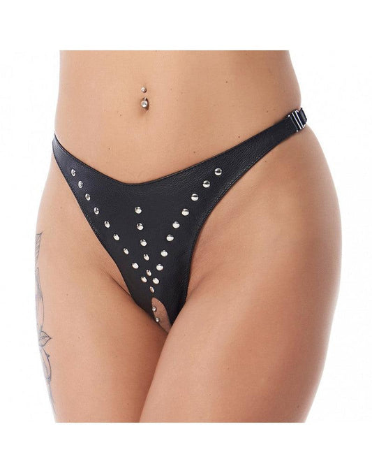 Rimba - Lederen Dames String met Open Kruis - Gedecoreerd met Studs - Zwart