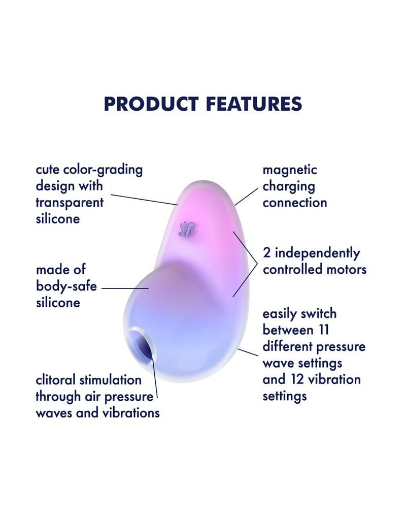 Mit dem Satisfyer Pixie Dust genießt du eine hypnotisierende Stimulation deiner Klitoris. Dank der innovativen, beliebten Satisfyer Air Pulse Technology stimuliert dieser Auflegevibrator deine Klitoris ohne direkten Kontakt, was zu außergewöhnlichen Höhepunkten führt. Platziere die Öffnung auf deiner Klitoris und erlebe wahre Magie, während du aus 11 verschiedenen intensiven Druckwellenprogrammen wählst. Aber der Satisfyer Pixie Dust hat noch mehr magische Kraft, mit 12 Vibrationsprogrammen, die du allein genießen oder dank zweier individuell einstellbarer Motoren mit Druckwellenprogrammen kombinieren kannst. Die Oberfläche des Satisfyer Pixie Dust ist aus superweichem Silikon gefertigt, das unglaublich sanft zu deiner Haut ist. Mit seinem reizvollen Farbverlauf und der transparenten Silikonschicht verführt dich dieses Lovetoy auch optisch.