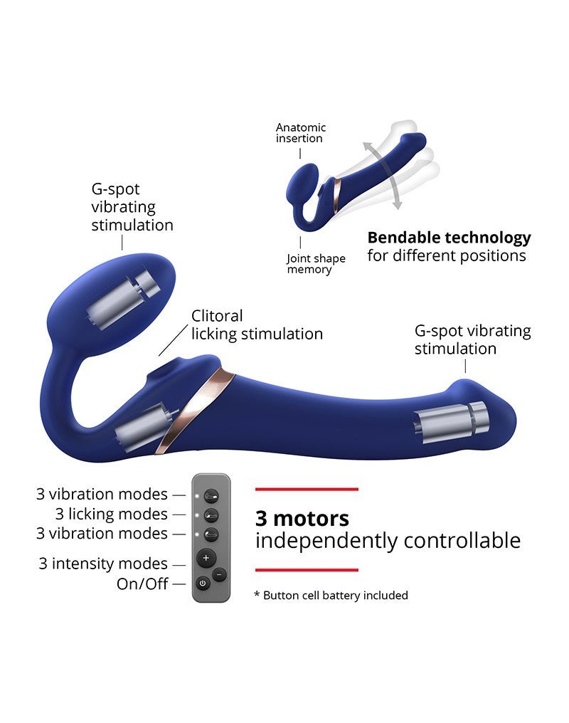 Die Kraft seiner drei separaten Motoren, die intuitive Fernbedienung und das elegante Design machen diesen Umschnallvibrator zum perfekten Begleiter für einen multisensorischen Orgasmus. Multi Orgasm kann auf alle möglichen Arten gebogen werden und hat 3 Vibrationsmodi und 3 Intensitäten. Der Umschnallvibrator ist mit 3 Motoren ausgestattet: einer am oberen Ende des Schafts, einer im einführbaren, vibrierenden Eierteil und einer am Anfang des Schafts. Multi Orgasm ist mit einem Leckstimulator ausgestattet, der die Klitoris verwöhnt.
