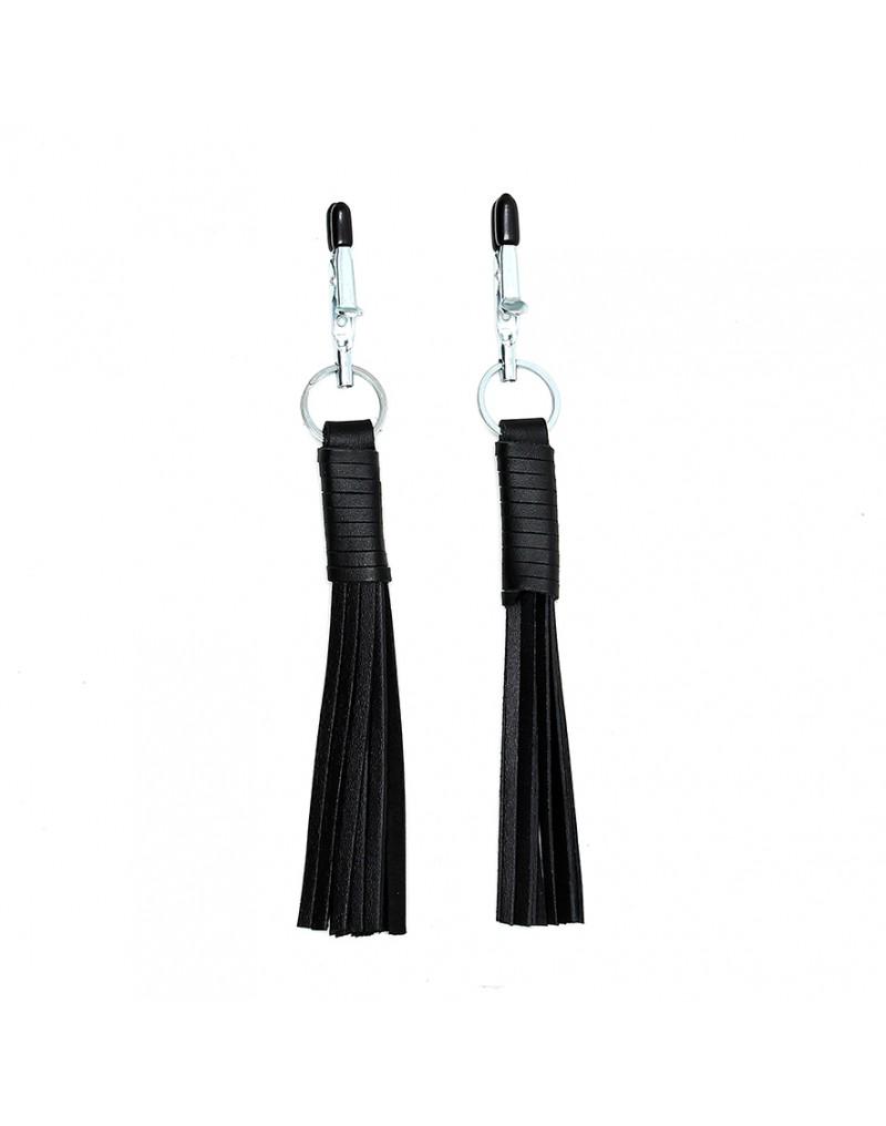 Elegant nipple clamps. There is a nice black leather mini whip on both clamps