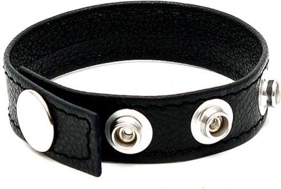 Leather cock ring with decorative staples, this band is adjustable by means of a press stud which is adjustable to 4 different positions: 13 - 15 - 17 and 19 cm.