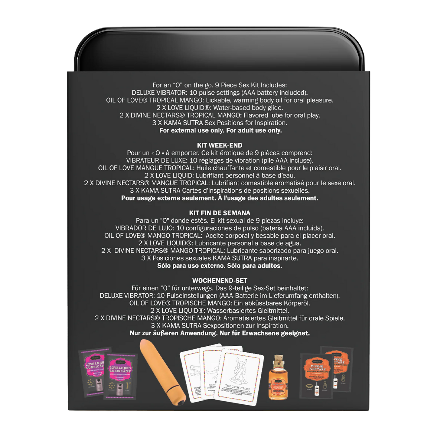 ¡Trae pasión tropical a tu fin de semana con el Kama Sutra Weekender Kit – Mango Tropical! Este lujoso set de regalos contiene todo lo que necesitas para un espontáneo, emocionante aventura, incluido un potente mini vibrador bullet, lubricantes de sabor exótico y un crema corporal besable y untar con sabor a mango tropical.