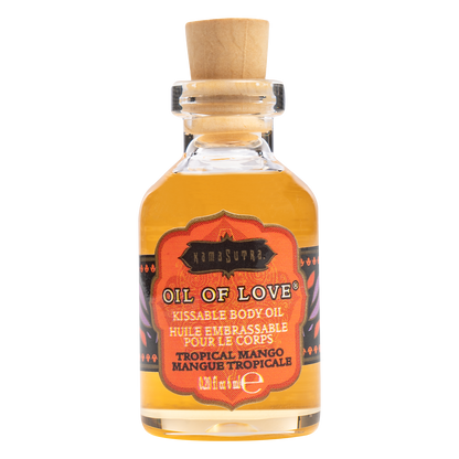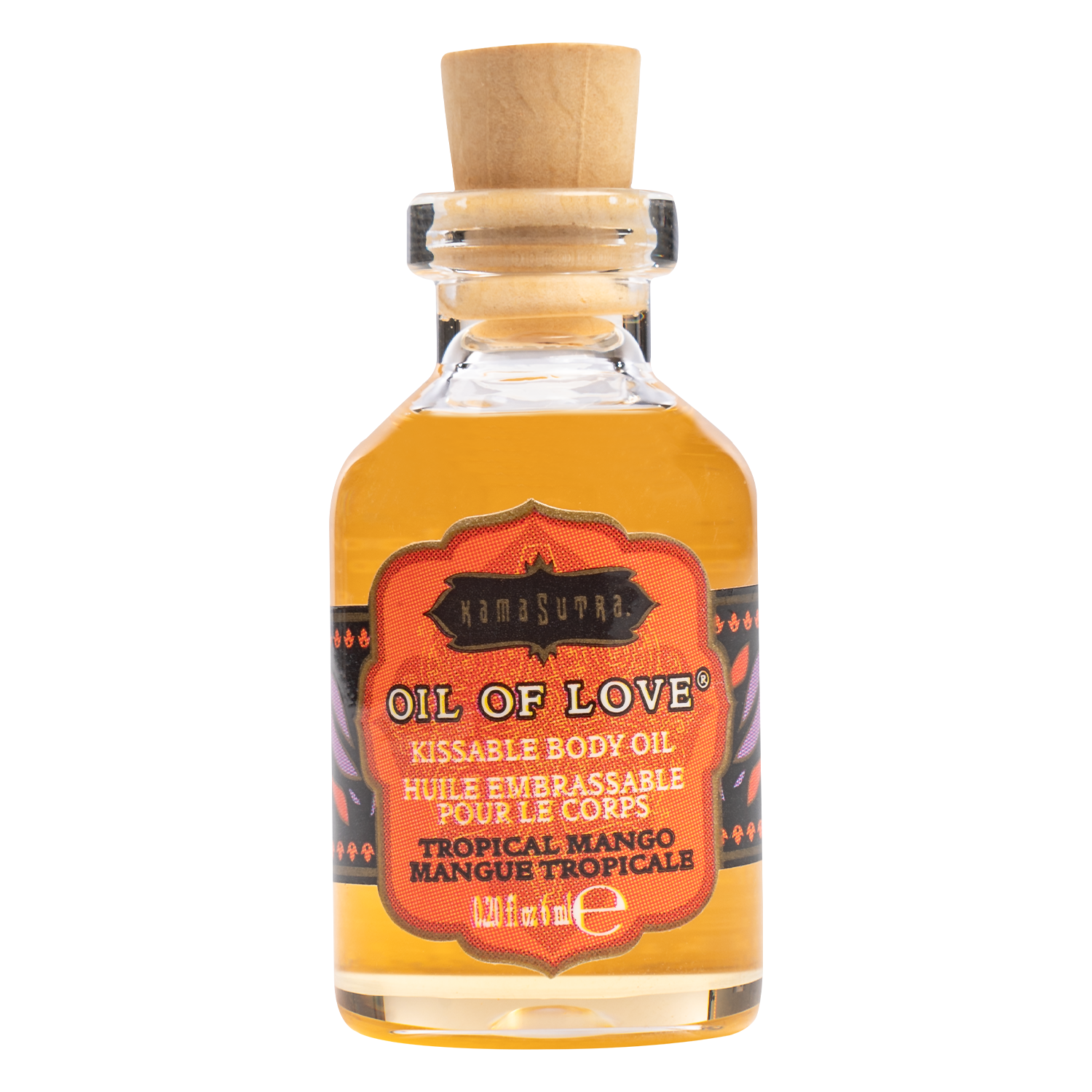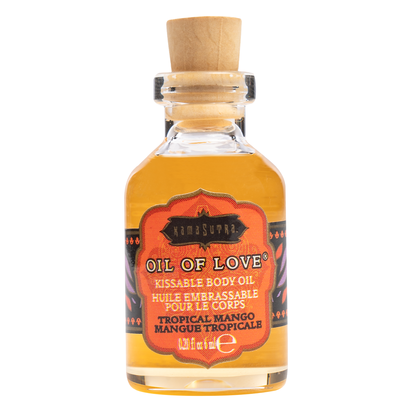 ✔ Aceite de Amor – un crema corporal besable y untuosa a base de agua con sabor a mango tropical y un sutil efecto calentador (6 ml).