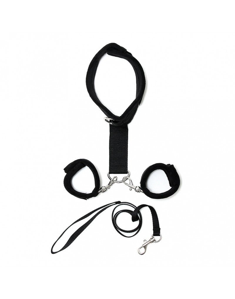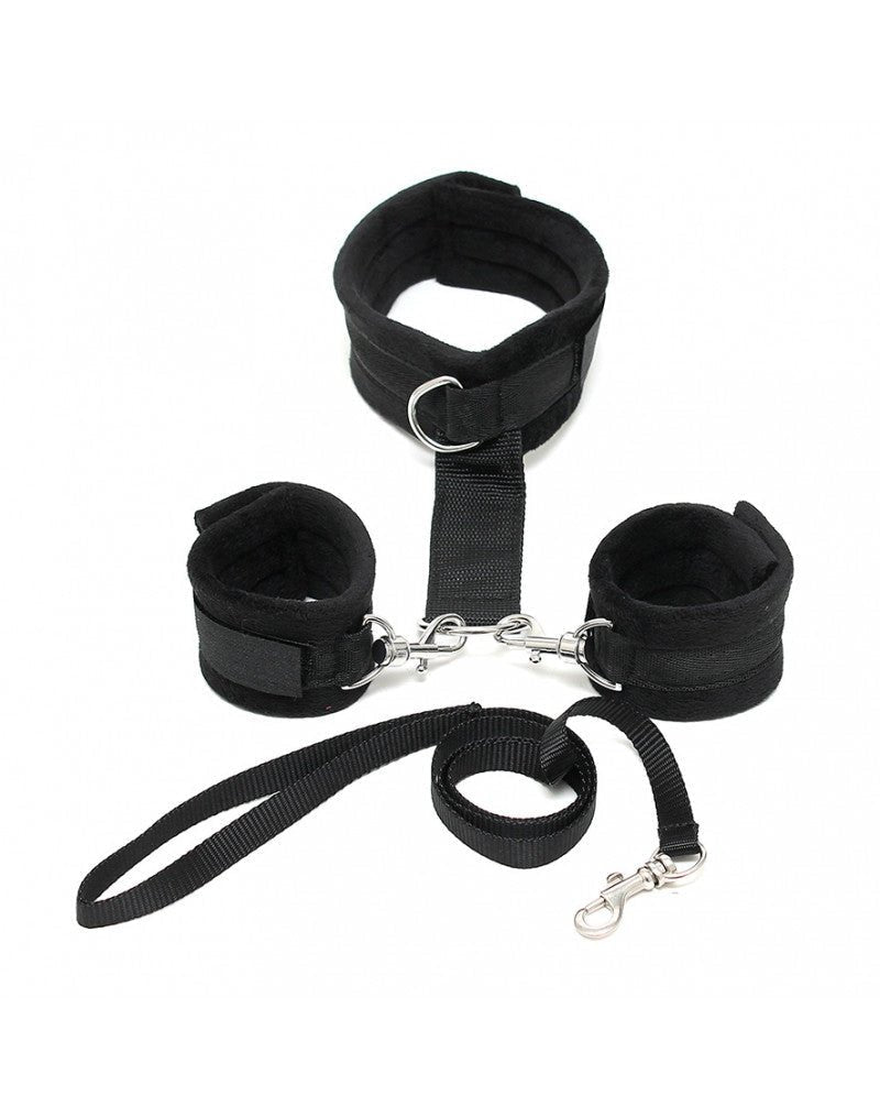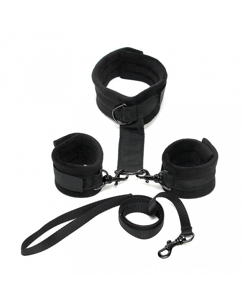 Puño de cuello bondage suave sujeto a una correa corta y sujeto a puños de muñeca, todos con cierre de velcro. El cuello tiene una correa desmontable. Disponible también en negro - violeta, ref. 7031