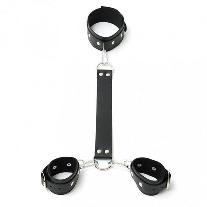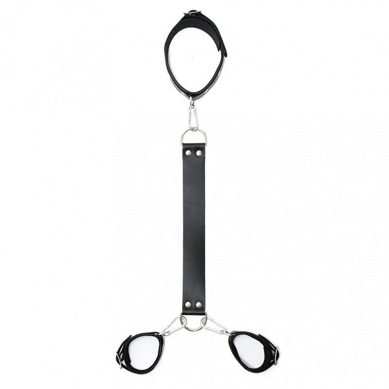 Rimba Bondage Play combinatie van echt lederen halsband met polsboeien verbonden met een riem. De halsband en boeien zijn verstelbaar door middel van metalen gespen en de afgebeelde karabijnhaken worden meegeleverd.