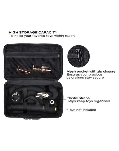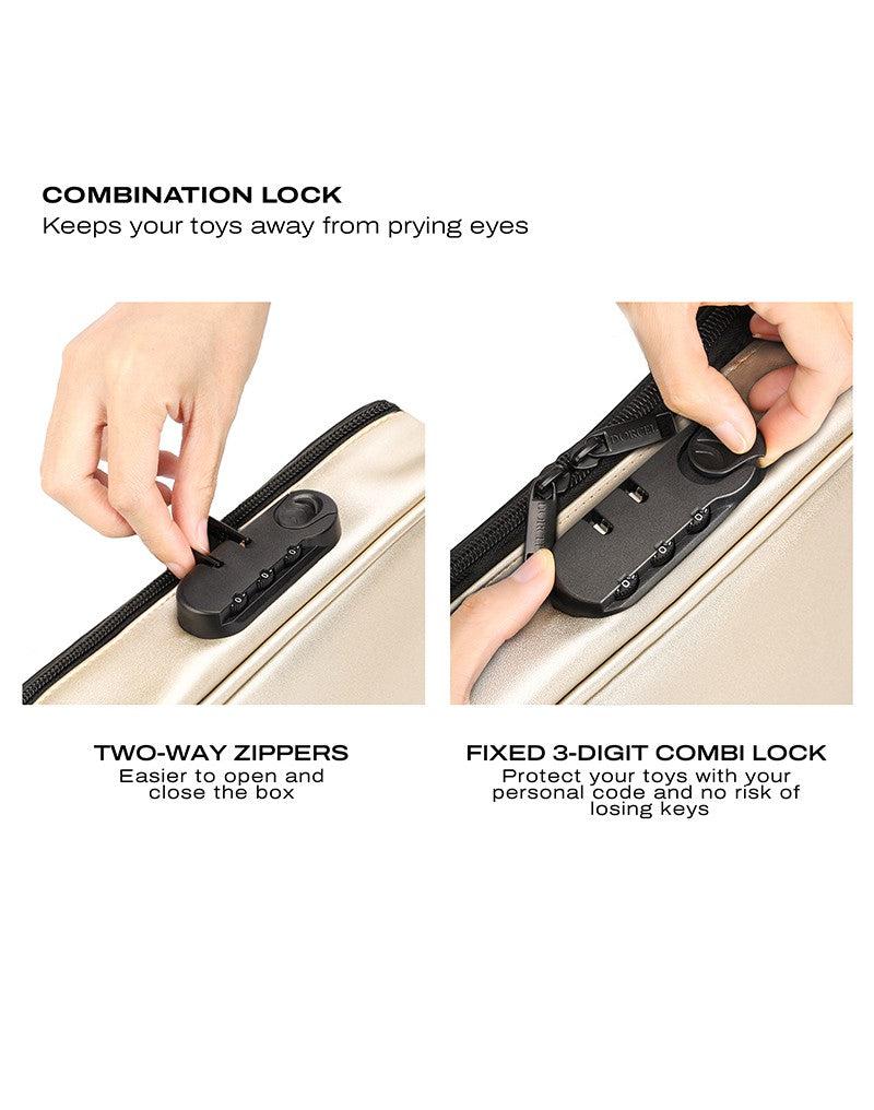 De Discrete Box van Dorcel is een luxe opbergdoos voor je seksspeeltjes en accessoires. Hij beschermt je speeltjes met een vast slotsysteem en een persoonlijke code. De capaciteit is 4-5 middelgrote speeltjes en het discrete ontwerp is perfect voor veilig reizen en opbergen. Het interne gaasvak en de elastieken houden accessoires en schoonmaakproducten perfect op hun plaats. De opbergbox heeft een 3-cijferig combinatieslot zodat u niet het risico loopt dat u uw sleutel verliest.