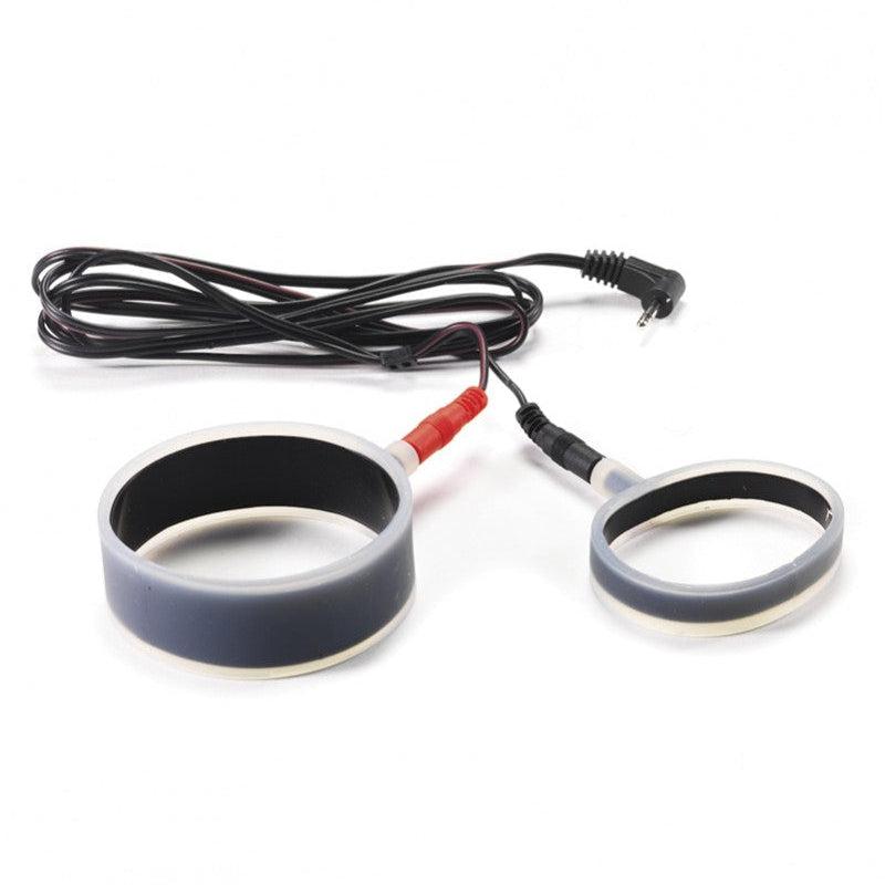Zachte siliconen cockring set met stroomdraad. Deze vlakke ringen zijn elk uni polar. Het zwarte gedeelte binnenin is geleidend. Om shocktherapie te verkrijgen moet je beide ringen samen te gebruiken of een van de ringen vervangen door een zelfklevende gel pad. De kabel heeft een 2,5 mm jack plug die past in onze 3 verschillende power box eenheden ref. Ri 7850 Ri 7880 en Ri 7890. Zorg ervoor dat u voldoende contact gel gebruikt om het beste contact met de huid te creëren.