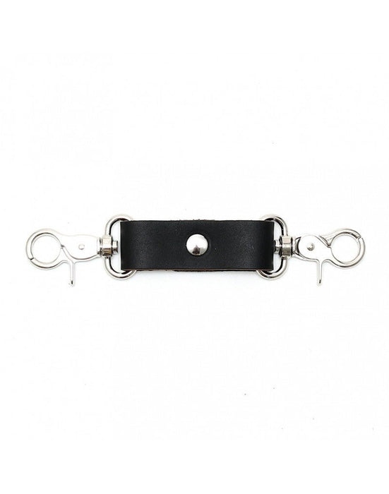 Rimba Bondage Play: 2 metalen snap haken verbonden door echte tuiglederen tussenstuk. Om je speelpartner machteloos vast te zetten. Verbind armen en benen met elkaar en laat je fantasie los.