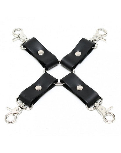 Rimba Bondage Play: 4 metalen snaphaken verbonden door echte tuiglederen tussenstukken om een hogtie te maken. Leg je speelpartner met alle vier de ledematen vast met dit kwaliteitsspeeltje van Nederlandse makelaardij.