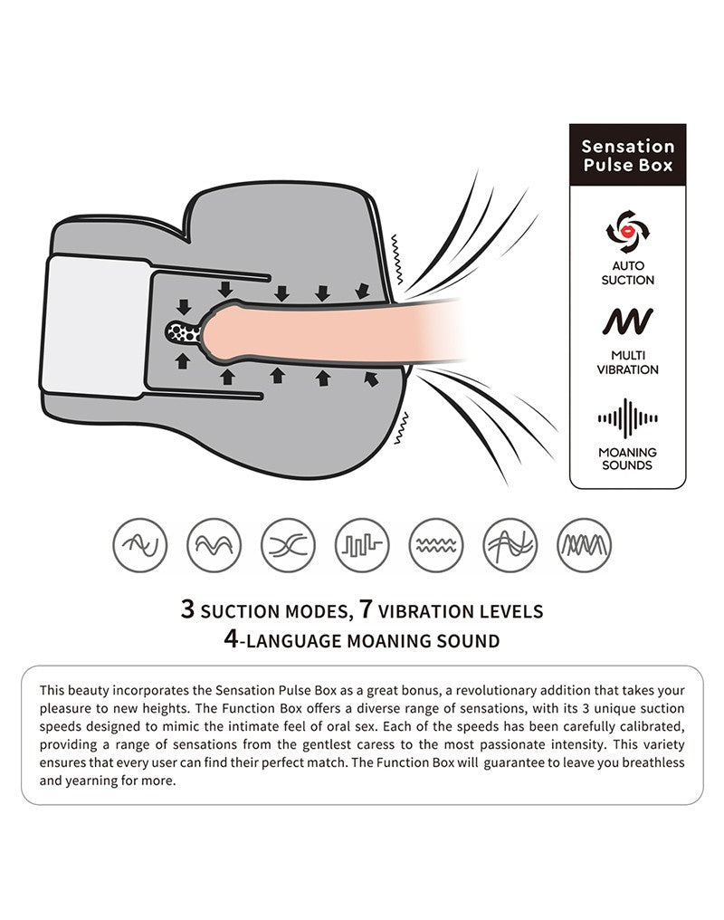 De Streetgirls Masturbator met de revolutionaire Sensation Pulse Box is gemaakt van realistisch, huidvriendelijk materiaal dat de vrouwelijke vormen nabootst en een levensechte ervaring biedt. De Pulse Box beschikt over 3 unieke zuigsnelheden, waarbij elke stand zorgvuldig is afgesteld om een scala aan sensaties te bieden, van een zachte streling tot intense passie. Met de toevoeging van realistische kreungeluiden en 7 vibratiefrequenties gaat deze Sensation Pulse Box nog een stap verder om een werkelijk onvergetelijke ervaring te creëren, die bij elke aanraking onweerstaanbaar genot oproept.