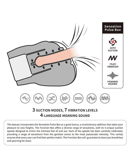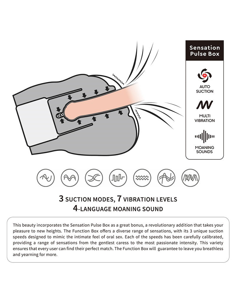 De Streetgirls Masturbator met de revolutionaire Sensation Pulse Box is gemaakt van realistisch, huidvriendelijk materiaal dat de vrouwelijke vormen nabootst en een levensechte ervaring biedt. De Pulse Box beschikt over 3 unieke zuigsnelheden, waarbij elke stand zorgvuldig is afgesteld om een scala aan sensaties te bieden, van een zachte streling tot intense passie. Met de toevoeging van realistische kreungeluiden en 7 vibratiefrequenties gaat deze Sensation Pulse Box nog een stap verder om een werkelijk onvergetelijke ervaring te creëren, die bij elke aanraking onweerstaanbaar genot oproept.