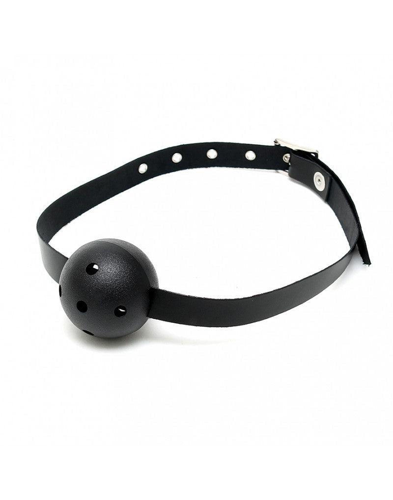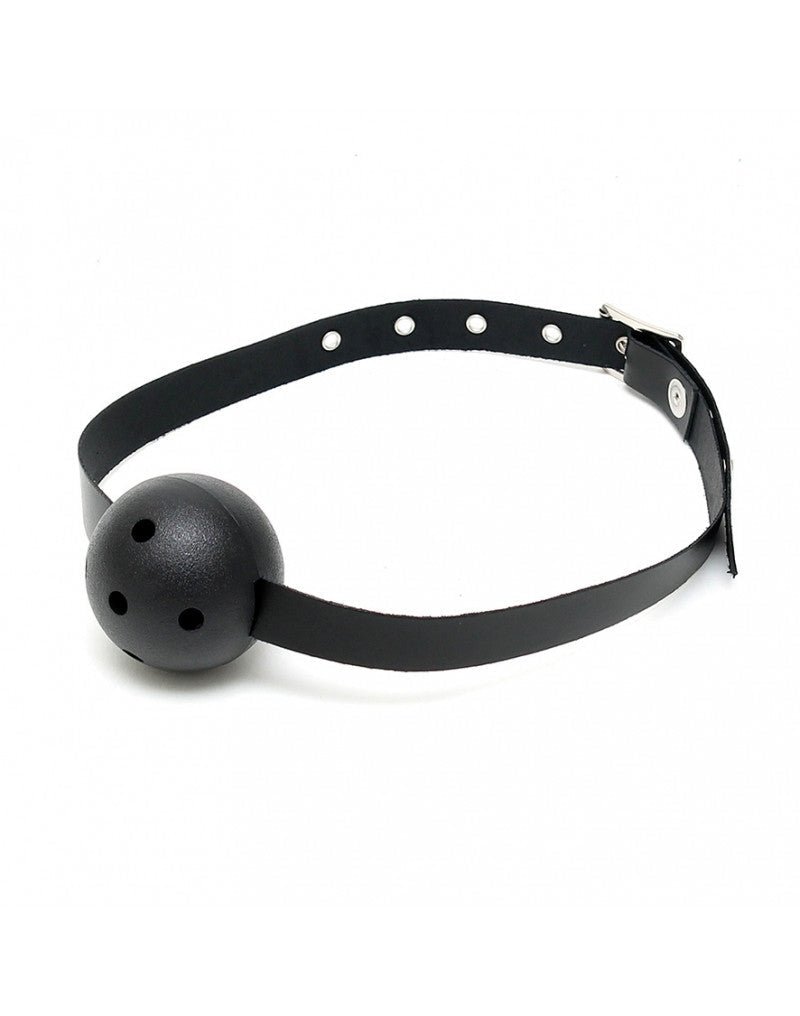 Mondknevel met kunststof bal met gaatjes. De verstelbare lederen band zorgt ervoor dat het mondknevel goed blijf zitten. Leder, Zwart verstelbaar met gespen. Luxe model