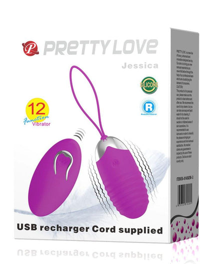 Pretty Love Jessica is een oplaadbare, geribbelde mini-eivibrator met afstandsbediening. Jessica heeft 12 vibratiefuncties. De afstandsbediening is niet oplaadbaar en heeft 1x AAA-batterij nodig om te werken.