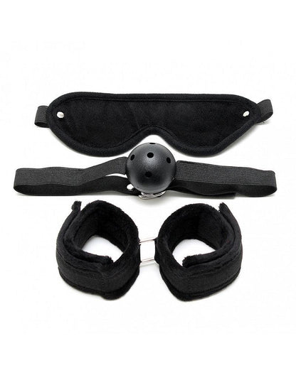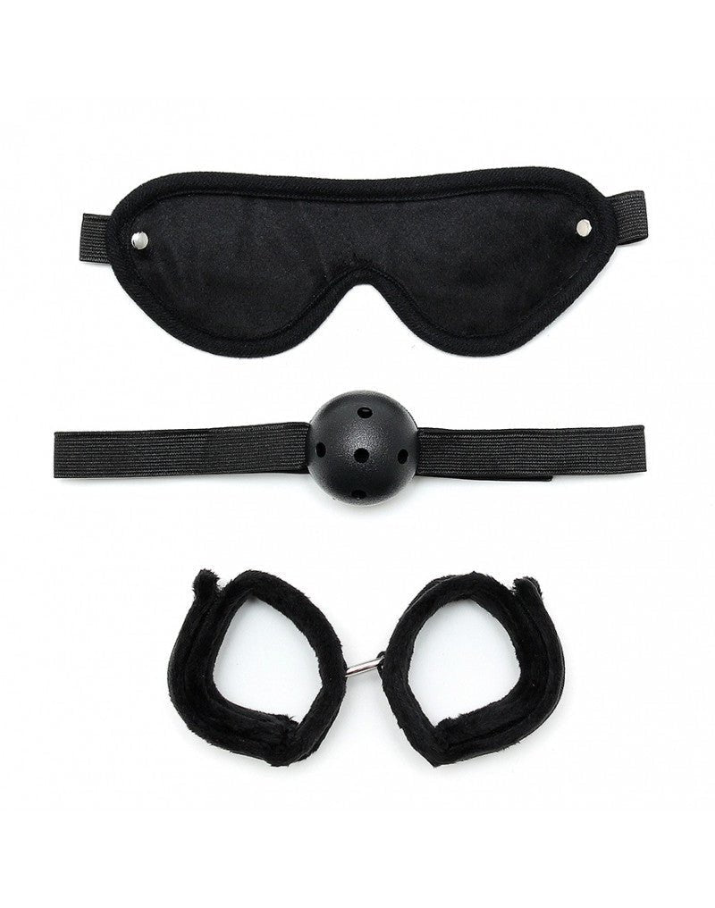 Deze soft bondage set van 3 delen bestaat uit 2 handboeien die aan elkaar zitten een blinddoek en een mondknevel (gag). Door de klitteband sluiten zijn de boeien, en gag makkelijk verstelbaar. De blinddoek heeft elastiek waardoor deze eenvoudig op en af gedaan kan worden.